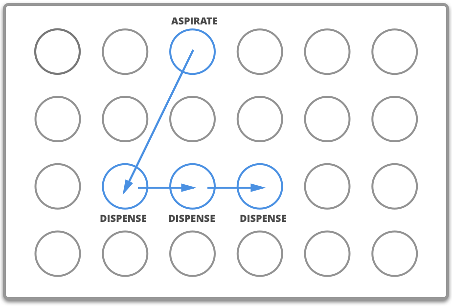 This will produce just 1 aspirate step and 12 dispense steps (when using a 1000 µL pipette). The pipette will aspirate enough liquid to fill all the wells, plus a disposal volume. Then it will move to A1 of the plate, dispense, move the short distance to A2, dispense, and so on. This greatly reduces gantry movement and the time to perform this action. And even if you’re using a smaller pipette, distribute() or distribute_with_liquid_class() will fill the pipette, dispense as many times as possible, and only then return to the reservoir to refill (see Tip Refilling for more information).